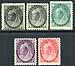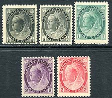 Canada #74-77, 74i. Fine mint Never Hinged selection of five 1898-1902 QV Numeral issues, including the 1/2c black, 1c grey green, 2c purple and 2c carmine. Complimented with an additional example of the 1/2c value in Unitrade listed grey shade (not listed in Scott, valued as basic stamp). 2025 Scott US$360.00 =