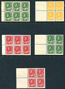 Canada #104a, 105a, 106a, 107b, 109a. F/VF mint Hinged (generally lightly) selection of five different Geroge V Admiral booklet panes. Nice deep colour on these, and centering well above average. 2025 Scott US$265.00 =