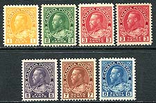 Canada #105/115. F/VF mint Never Hinged group of 7 different George V Admirals, including both Die I and Die II of the 3c carmine. Some nicely centered stamps in the group, all valued as the least expensive shade / printing. 2025 Scott US$552.50 =