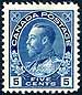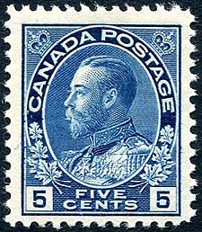 Canada #111. Fresh and F/VF mint Never Hinged example of the 1912 issue 5c dark blue KGV Admiral. One of the key Admiral values. 2025 Scott US$500.00 =