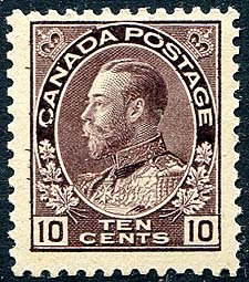 Canada #116. Fresh and Fine mint Never Hinged example of the 1912 issue 10c plum KGV Admiral. One of the key early Admirals, this one with pristine NH gum. 2025 Scott US$700.00 =