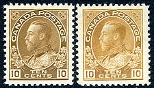Canada #118, 118b. VF mint Never Hinged (#118) and Hinged (#118b) examples of both the Unitrade listed shades (bistre brown / yellow brown) of the 10c brown George V Admiral. Nice to get them both at once, which easily shows the difference in the shades when placed "side by side". 2025 Scott US$180.00 =