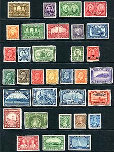 Canada #135/216. F/VF mint Hinged (mostly lightly) selection of 35 different 1917-1935 George V era issues, all neatly arranged on a single stockpage. Includes 1917 Confederation, 1927 Historical, 1927 Confederation, 1932 Ottawa Conference, 1932 Medallion, 1933-1934 commemoratives (UPU, Cartier, Royal William, Grain Conference, New Brunswick, Loyalists) and 1935 Silver Jubilee. All in complete sets. A tidy offering. 2025 Scott US$420.30 =