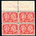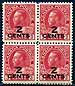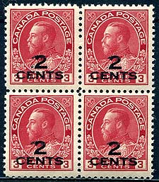 Canada #140a. Double Surcharge Variety. VF mint block of the 1926 "2 CENTS" George V Admiral surcharge, with clear doubling of the "2" and small parts of "CENTS" on each stamp. The block has disturbed / glazed gum, so valued as Hinged. 2025-2026 Unitrade =