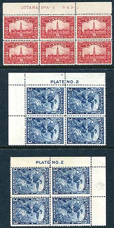 Canada #143, 208 Plate Blocks. Attractive trio of early Plate Blocks, starting with the 1927 Confederation 3c value, with full "Ottaw No.A-2" inscription in VF mint Never Hinged block of six. This is followed by a duo of 1934 Jacques Cartier, LL and UL inscription (Plate No.2) blocks of four, both with stamps NH, but hinged in selvedge (one Fine, one VF). 2025-2026 Unitrade =