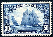 Canada #158. VF mint Very Lightly Hinged example of the 1929 issue 50c Bluenose. Canada's best-known stamp, a "must have" item in any self-respecting Canadian collection. 2025 Scott US$225.00 =