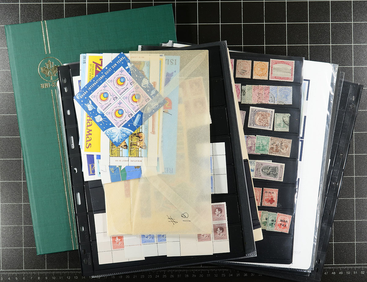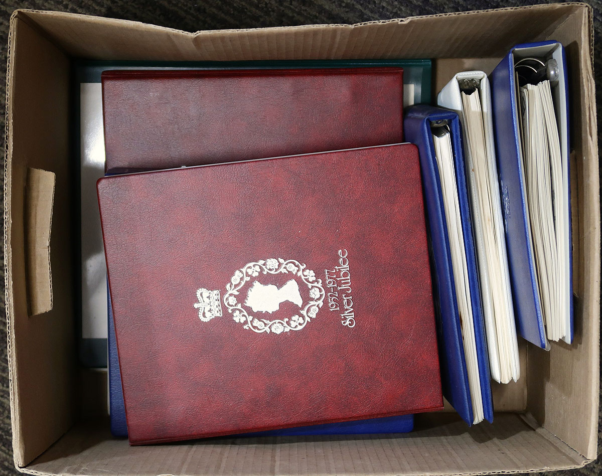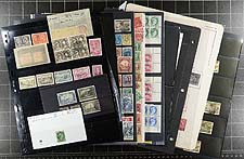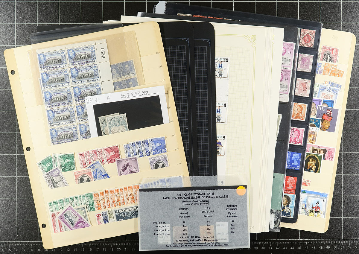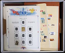 Canada - Large accumulation of primarily used Canada stuffing a banker's box, 1870's-1990's. This interesting lot contains thousands of stamps in a variety of formats, including a few albums, over 100 album pages, stamps on and off paper in 2 boxes, and some loose material. A spot check revealed several classic stamps from the Small Queens up to the 1940's (many well organized on album pages), Elizabethan mint and used (including several mint plate blocks), back of the book issues, and surely more. We estimate $50 to $75 of usable face value postage, and a nice lot for the postmark hunter as we encountered several "socked on the nose" town cancels. A nice lot with possible finds for the dedicated collector, overall fine to very fine. Estimate =