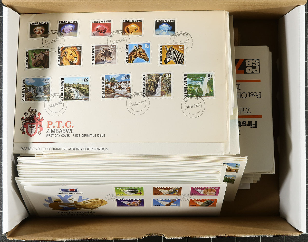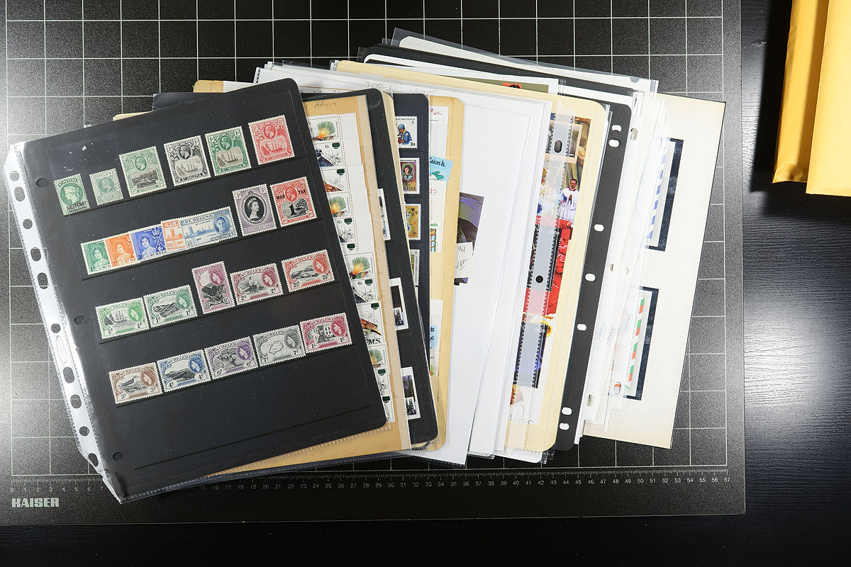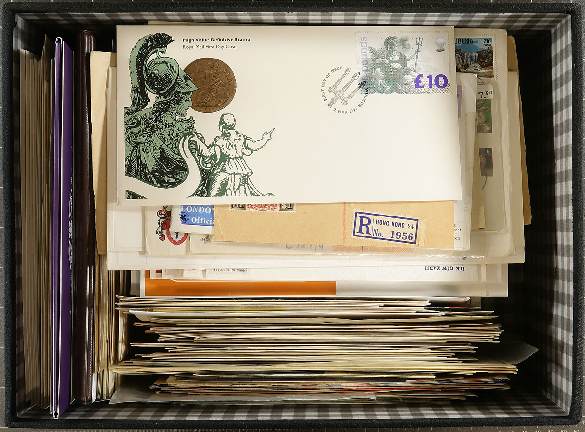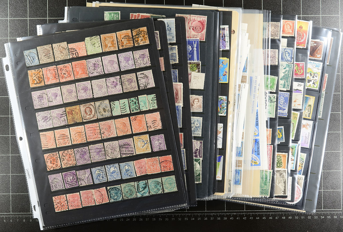 Canada - Large accumulation of primarily used Canada stuffing a banker's box, 1870's-1990's. This interesting lot contains thousands of stamps in a variety of formats, including a few albums, over 100 album pages, stamps on and off paper in 2 boxes, and some loose material. A spot check revealed several classic stamps from the Small Queens up to the 1940's (many well organized on album pages), Elizabethan mint and used (including several mint plate blocks), back of the book issues, and surely more. We estimate $50 to $75 of usable face value postage, and a nice lot for the postmark hunter as we encountered several "socked on the nose" town cancels. A nice lot with possible finds for the dedicated collector, overall fine to very fine. Estimate =
