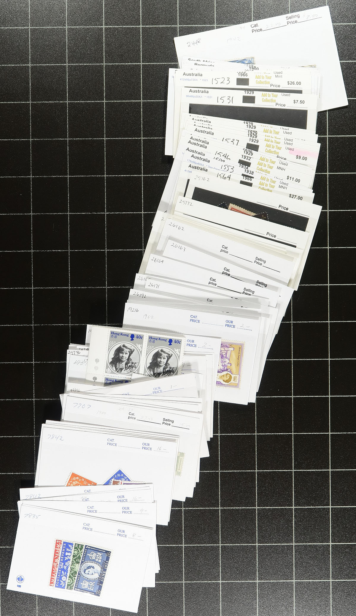 Canada - A "back of the book" holding, which extends in the non-Unitrade listed items (such as revenue stamps, listed in van Dam catalogue and elsewhere). A total of 50x "102" cards, with some cards containing multiple stamps and sale prices per card (a fraction of catalogue value) ranging generally $2-$15). Includes Postage Due, War Tax, Special Delivery, Airmail Special Delivery, OHMS, Wildlife Conservation and even a couple Edward precancels. Of particular note is a series of card containing multiple examples of Canada / BC fishing conservation stamps. Estimate =