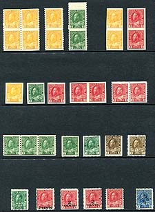 Canada #126a/130, 184 plus War Tax. An interesting array of George V Admirals, all being Coils, part-perforates, imperforates and War Tax, all neatly arranged on a single stockpage. Includes a block, a strip of three, six pairs and 14 singles. A mix of hinging, generally Lightly Hinged, but with a couple NH and a couple Hinge remnant. The 5c diagonal "WAR TAX" at lower-right is used, and included (indistinct postmark/revenue cancel). The catalogue value adds up quickly here. Estimate =