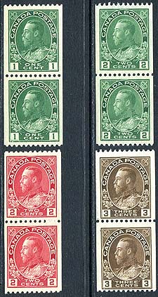 Canada #131-134. F/VF mint Hinged set of the 1915-1924, perf 12 horizontal Admiral coil stamp series, all in pairs. A very respectable example of this set, with pairs being exponentially harder to find than singles. 2025 Scott US$289.00 =