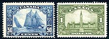 Canada #158-159. Fresh and Fine mint Never Hinged examples of the 50c Bluenose and $1.00 Parliament high values from the 1928-1929 George V "Scroll" series. A lovely duo. 2025 Scott US$1,000.00 =