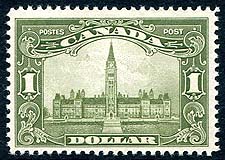 Canada #159. Fresh and VF centered mint Never Hinged example of the 1929 issue $1.00 olive green Parliament high value from the GeoV Scroll set. The $1.00 Parliament is considered by many to be the key GeoV era high value. 2025 Scott US$575.00 =