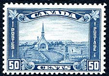 Canada #176. F/VF centered mint Never Hinged example of the 50c dull blue "Grand Pre" from the 1930-1931 issue GeoV "Arch" set. Very deep and rich colour. A real beauty! 2025 Scott US$350.00 =