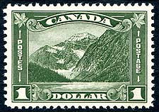 Canada #177. VF mint Never Hinged example of the 1930 issued $1.00 dark olive green "Mount Edith Cavell" top-value of the King George V "Arch" or "Leaf" issue. An attractive, fresh stamp, with great colour and pristine gum. A lovely example of this issue. 2025 Scott US$350.00 =
