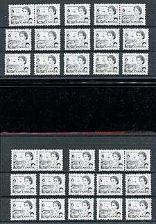 Canada #460ii. Wholesale 6c black "Centennial" die 1a perf 12.5x12 with "Hibrite" paper. A total of 30 mint never hinged copies, including 2 pairs. A nice version from one of Canada’s most popular sets. 2025-2026 Unitrade =