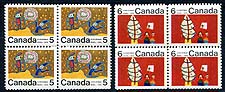 Canada #522pi, 525pi. VF mint Never Hinged identical centre blocks of four of the 5c and 6c 1970 Christmas issue, both with Winnipeg tagging. NOTE: the untagged 6c block is WITHOUT the "Scratch through Window" variety and as such is worth a 50% premium. An always popular QEII issue, of which has only been increasing in popularity in recent years 2025-2026 Unitrade =