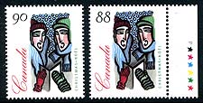 Canada #1535ii. VF mint Never Hinged example of the rare and unissued 90c value from the 1994 Xmas proposed and rejected rate change. Fewer than 1,000 examples of the 90c stamp exist. The Post Office intended to increase the postal rates from 88c but changed their minds at the last minute. Somehow a few of these stamps made it onto the market. Oops! A famous modern "administrative" error. Issued 88c value included for comparison. 2025-2026 Unitrade =