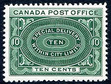 Canada #E1ii. F/VF mint Lightly Hinged example of the Unitrade listed "no shading in value tablet" variety of the 1898 issue 10c green Special Delivery stamp. Here's your chance to get a great little mint stamp without having to pay a hefty premium for NH. Valued as a basic stamp by Scott. 2025 Scott US$170.00 =