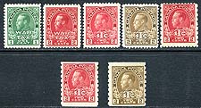 Canada #MR1-MR7. Complete basic mint Lightly Hinged set of all seven 1915-1916 issue GeoV War Tax stamps. All fresh and fault free. Noted some lovely VF stamps in the mix. 2025 Scott US$375.00 =