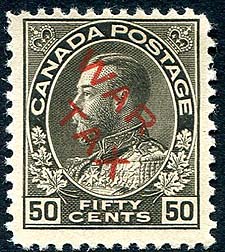 Canada #MR2D. Fine mint Hinged example of the 50c black KGV Admiral with diagonal "WAR TAX" overprint in red. A seldom seen "back of the book" item. 2025-2026 Unitrade =