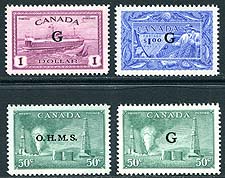 Canada #O11, O24, O25, O27. VF mint Never Hinged quartet of better Official issues, including the $1.00 Train Ferry "G", $1.00 Fisheries "G" and 50c Oil Industry (with both "G" and "O.H.M.S." overprints). A wonderful offering, Post Office fresh with pristine gum. 2025 Scott US$233.50 =