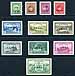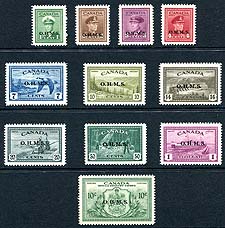 Canada #O1-O10, CO1, EO1. Fresh and F/VF mint Lightly Hinged complete run of first the 1949-1950 "O.H.M.S." overprinted official set of nine plus the Official Airmail and Official Special Delivery stamps. Includes the very scarce 50c Lumbering (#O9, only 50,000 overprinted). 2025 Scott US$426.50 =