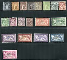 French Morocco #55-71. The complete WWI-era issue, the first produced specifically for and depicting Morocco. A tough set of 17 to find complete, mint, and this is a beauty, with the high values being fresh and well centered. All are hinged, with the occasional natural gum bend here or there. 2024 Scott US$331.60 =