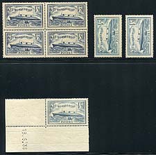 France #300, 300a. VF mint group of the 1935 issued 1f50c "S.S. Normandie" with a block of four of the dark blue (Never Hinged), plus three singles in the pale blue shade (two are Never Hinged, and includes a dated corner copy). An attractive grouping. 2026 Scott US$401.00 =