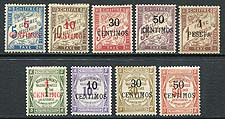 French Morocco #J1-J9. The complete first two postage due issues of 1895 and 1909, with overprints on French dues. An attractive mint, hinged, group of nine stamps. All hinged, a couple with hinge remnants. The good #J5 has possibly been regummed although it catalogues the same mint and used. We rarely see this "back of the book" material. 2024 Scott US$622.00 =