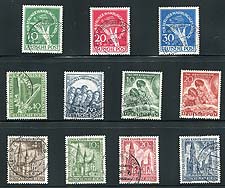 Germany - Berlin #9NB1-9NB11. Used examples of the first 11 semi-postals for Berlin issued 1949-1950. The cancels look good, but forgeries are known to exist. A tough group to get. 2025 Scott US$654.50 =