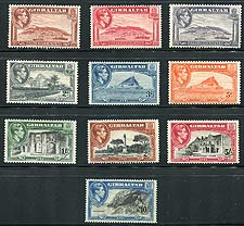 Gibraltar #108/117a. Group of mint George VI Pictorial issues, with perforation varieties. Includes Scott #108, 109, 109A, 110c, 111a, 112, 114, 115, 116b and 117a. Mostly Lightly Hinged, with the high-value being Never Hinged. The Stanley Gibbons numbers are 122b, 123, 123b, 125c, 124b, 125a, 127b, 128, 129a and 130 (Gibbons cat £381.00). 2026 Scott US$259.00 =