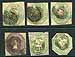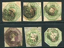 Great Britain #5/7. A study group of a half dozen 6d and 1/- octagonal stamps of 1847. The four copies with the corners intact are all space fillers, but attractive ones. Two of the shilling stamps are cut squares, one has been backed onto a piece, neither is counted. Great space fillers until you can find better examples. Owner's 2024 Scott US$4,000.00 =