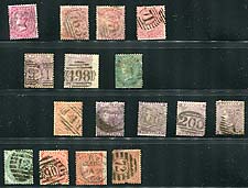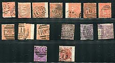 Great Britain #43/53. Mid-1860's, group of 15 used and mostly different medium-value issues, with various shades, plate numbers and cancels (noted an Alexandria "B01"). Condition is mixed, and we recommend any stamps with hinge remnants be soaked rather than trying to peel off the hinges. 2024 Scott US$1687.00 =