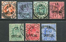 Great Britain #O11/O21. Seven attractive used "I.R. Official", Inland Revenue overprints on late Queen Victoria and King Edward VII issues, three with "socked on the nose" cancels. Includes #O17 and #O21. 2024 Scott US$540.25 =