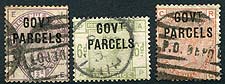 Great Britain #O27/O30. Trio of used Queen Victoria 1883-1886 issues overprinted "Govt Parcels", with usual parcel cancels. The overprints look good. Usual minor faults that come from being on parcels. 2024 Scott US$2065.00 =