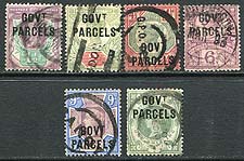 Great Britain #O31-O36. All six values of the original Queen Victoria "Jubilee" issue that were overprinted "Govt Parcels". The overprints look good, not surprisingly with parcel cancels. Usual minor faults from being on large items, not well suited for the preservation of stamps. 2024 Scott US$932.50 =