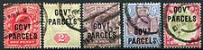 Great Britain #O39-O43. Complete set of the "Govt Parcels" official overprints on King Edward VII issues of 1902. Each with a parcel cancel and better than average condition. These stamps typically have condition issues due to being on non-standard items which exposed them to non-standard wear and tear. 2024 Scott US$685.00 =
