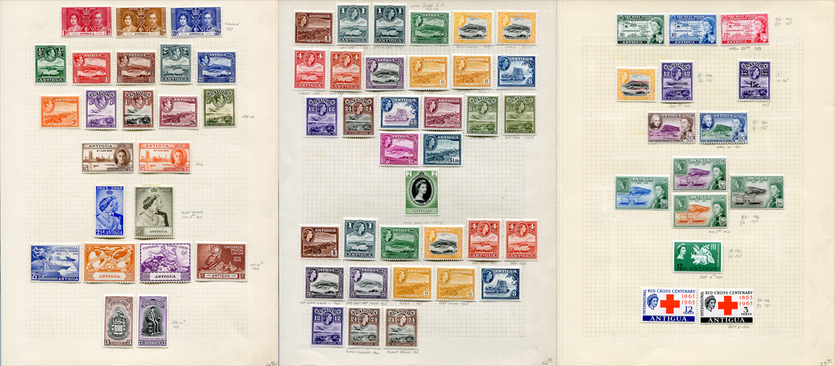 Antigua #81/135. Attractive George VI/QEII mint collection, lightly hinged on the original collector's pages. Includes many complete sets and Omnibus issues. 2026 Scott US$277.90 =