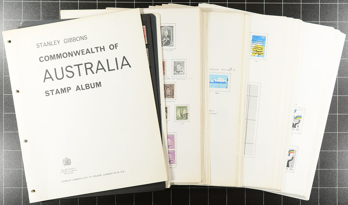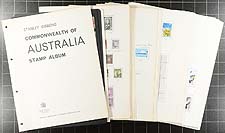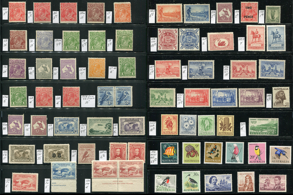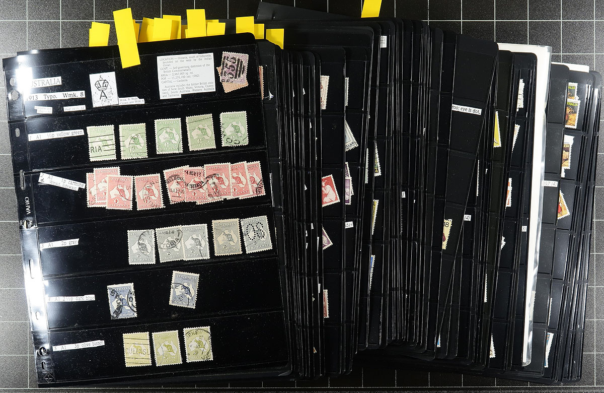 Australia - Large collection / accumulation of mint and used Australia, 1913-1987, containing several thousands of stamps in many double sided stock pages housed in a very thick binder. The lot generally ranges from Scott #1/1034, containing singles, sets, and back of the book issues, with most stamps identified by the owner. The lot begins with roughly 140 used Kangaroo issues (including #43-44), and a few hundred KGV Heads, all with a variety of watermark types, along with a few 'OS' perforated issues. The lot continues with a mix of mint and used issues from the 1930s onwards with a probable few hundred dollars worth of face value stamps. A nice lot for the specialist and a potentially high cataloguing lot, as a spot check indicated some stamps cataloguing $10 to $30 and up each. A few faults with a few stamps, overall fine to very fine. Estimate =