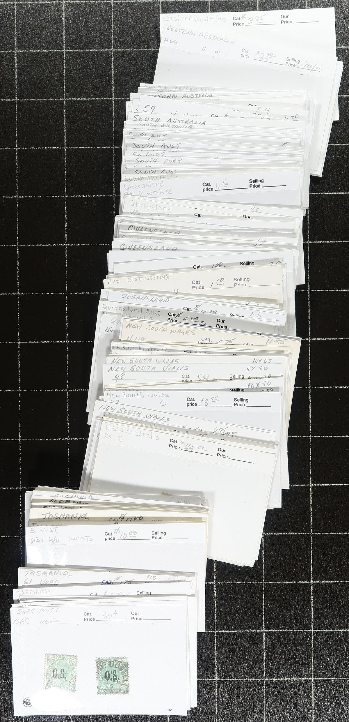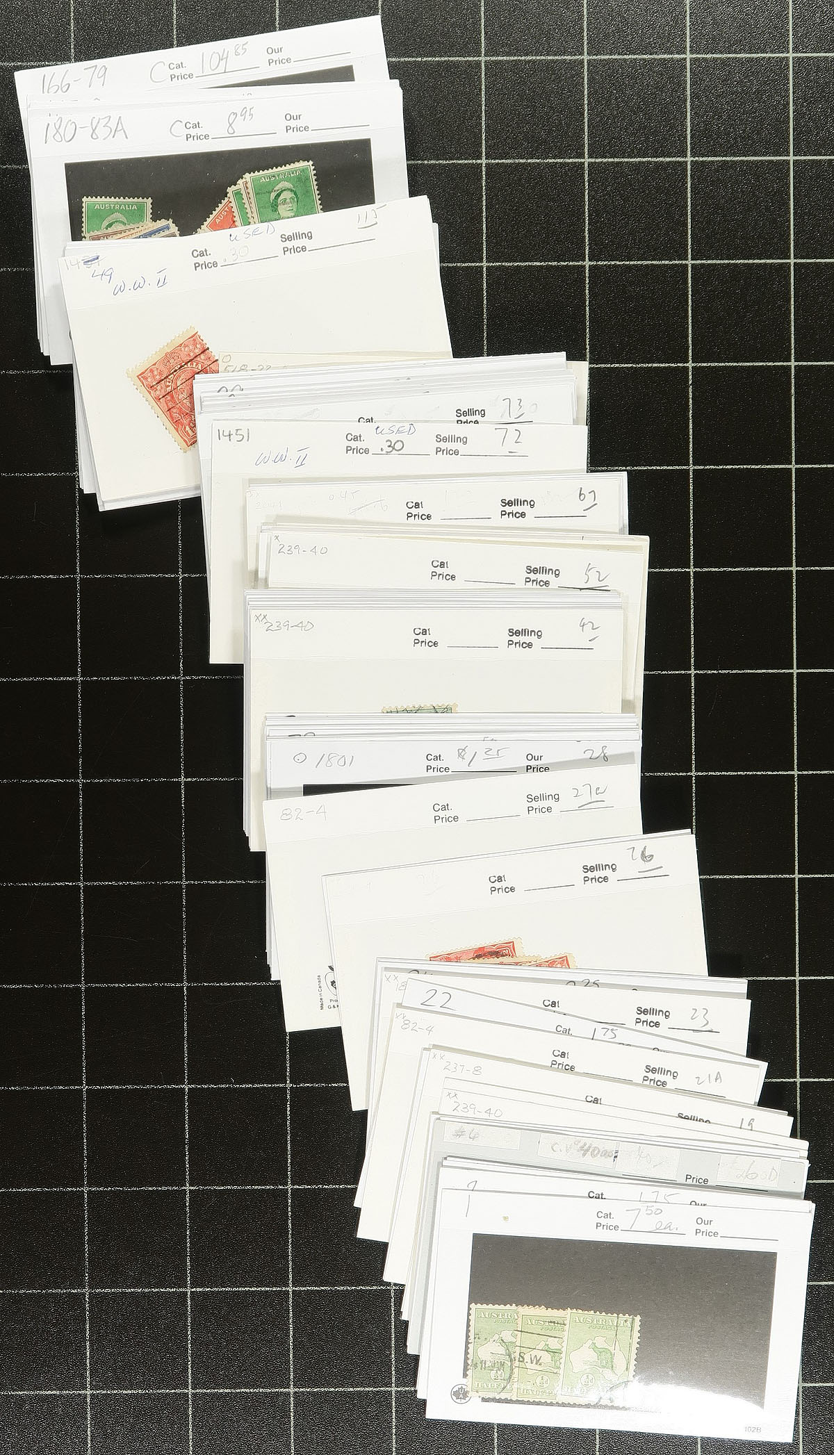 Australian States - Victoria - Group of mint and used stamps in roughly 130 dealer 102 cards, generally ranging from the late 1860's to 1900's. The group has representation from all the states, except Victoria, with each card identified by Scott numbers and have older catalogue values, typically one stamp per card, with a few ranging from 2 to 5 stamps per card. Most of the cards have catalogue values ranging from to $4 to $20 each and up, with a total value of US$1,131.65. A few small faults with a few stamps, still a nice lot for the Australia or Commonwealth collector, overall fine to very fine. Estimate =