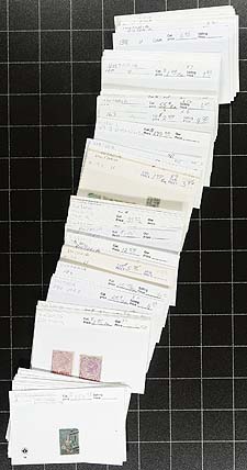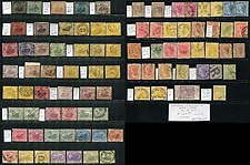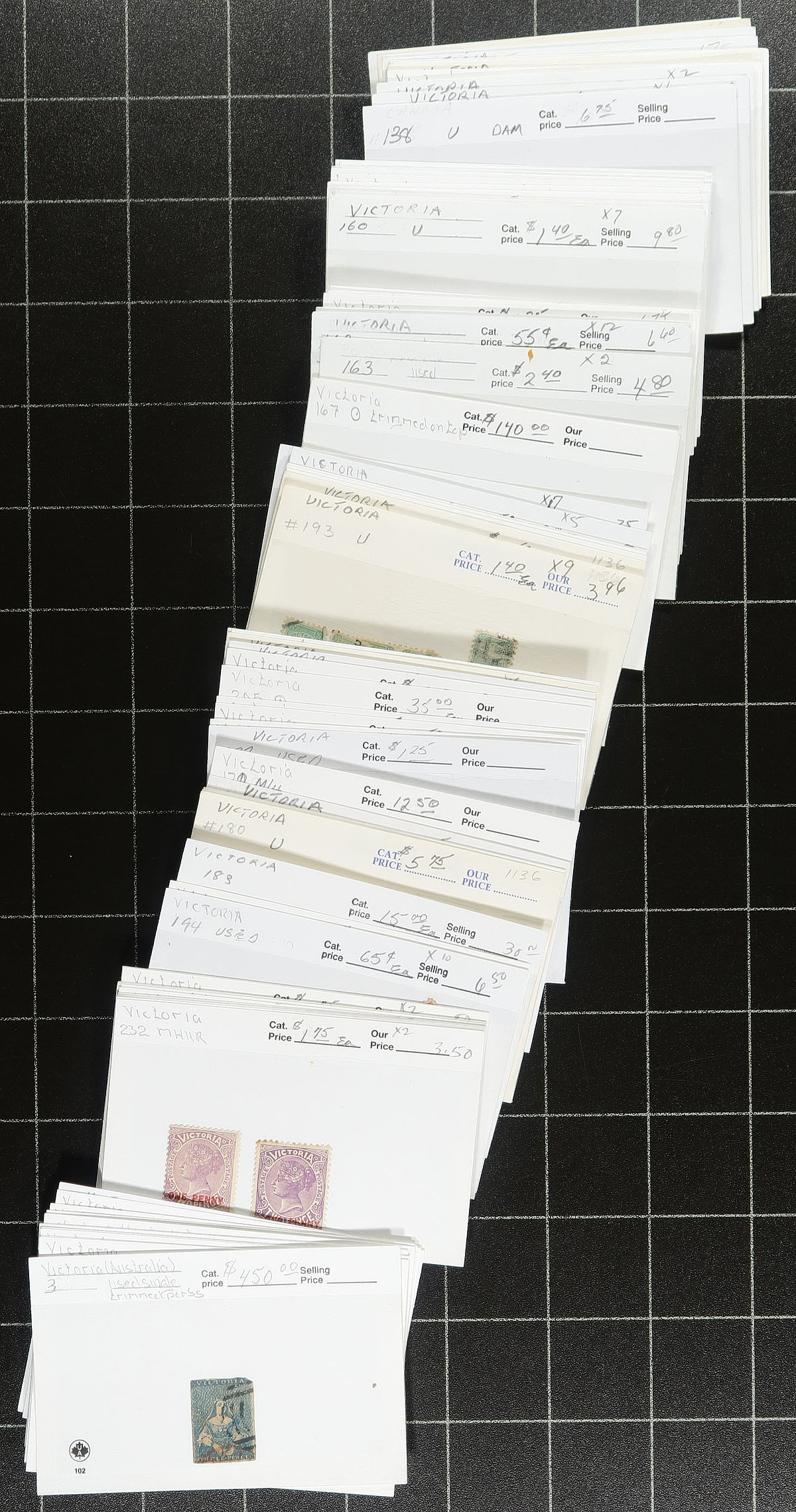 Australian States - Victoria - Group of mint and used stamps in roughly 80 dealer 102 cards, generally ranging from the late 1850's to 1912. The group ranges from Scott #3/232 along with a few postage due issues, with each card identified by Scott numbers and have older catalogue values, typically one stamp per card, with a few ranging from 2 to 5 stamps per card. Most of the cards have catalogue values ranging from to $4 to $20 each and up, with a total value of $976.20 for the lot (a few stamps were not counted due to obvious faults). A few small faults with a few stamps, still a nice lot for the Australia or Commonwealth collector, overall fine to very fine. Estimate =