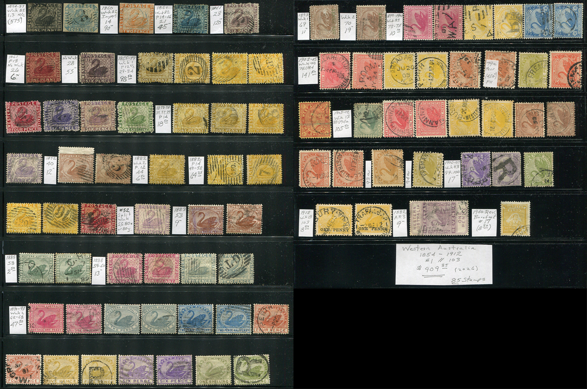 Australian States - Western Australia #1/103. Used collection of 85 stamps, from the 1854-1912 period, all neatly arranged and identified on a double-sided stockpage. Noted several better, including postmarks throughout. Expect the odd small fault, but overall a clean offering. 2026 Scott US$909.35 =