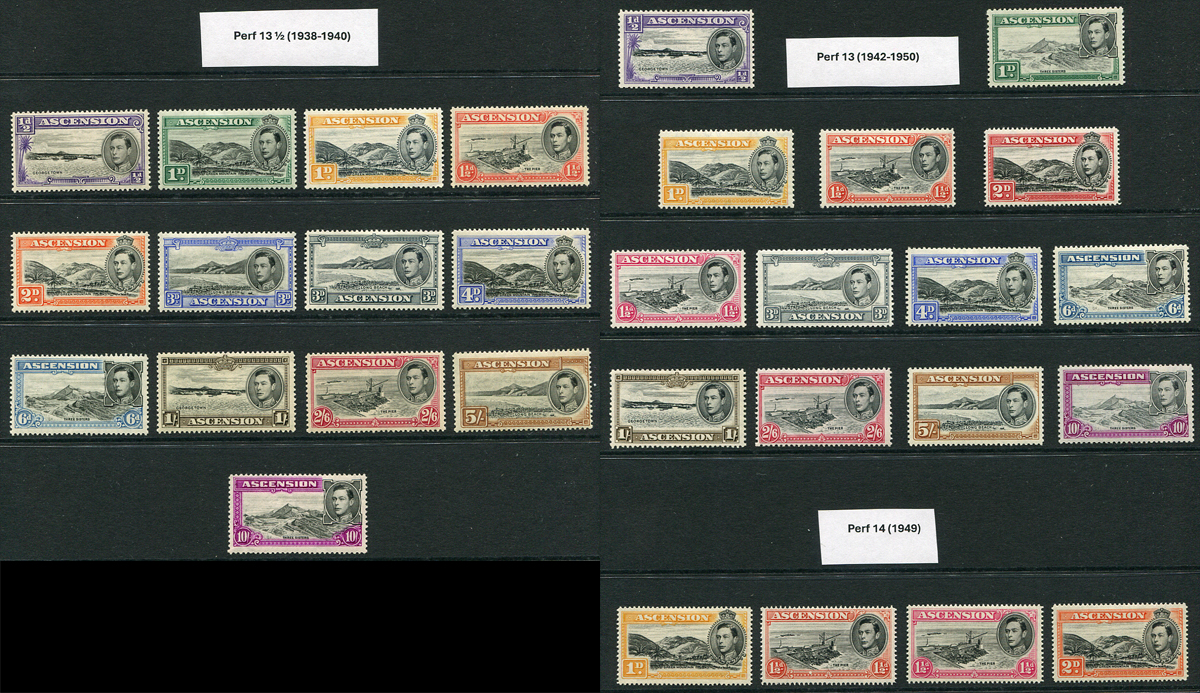 Ascension #40-49 plus subtypes. VF mint Hinged assembly of identified 1938-1953 George VI Pictorial issues (30 different) in perfs 13, 13 ½ and 14. A tough to assemble and complicated grouping. 2026 Scott Classic US$418.90 =