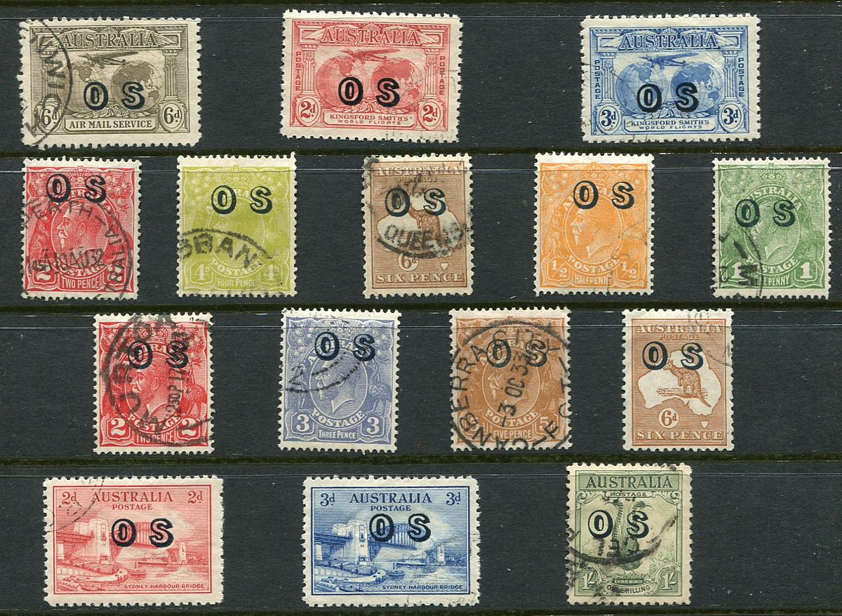 Australia #CO1, O1-O14. Attractive used selection of 1931-1932 Australian Official Stamps, including many better light postmarks. An appealing "back of the book" group. 2026 Scott US$364.25 =