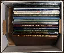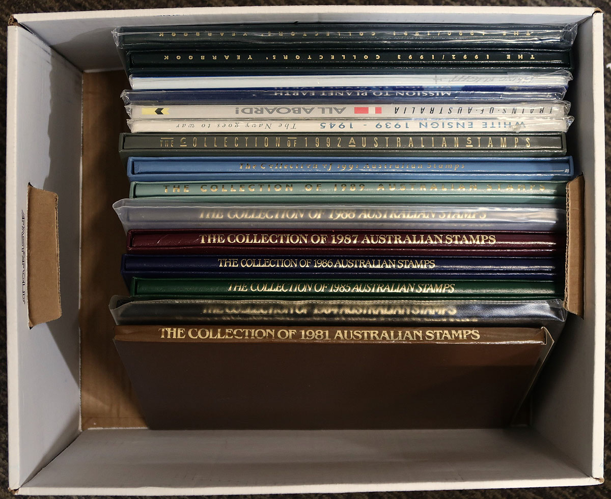 Australia - Fifteen different Annual Collections and commemorative presentation booklets, all with their original stamps. Year Sets with their slipcover from years: 1981, 1984-1989, 1991-1992, plus "Collector Yearbooks" for 1990/1991 and 1992/1993 with Booklets Frama and self-adhesive stamps and (unopened) early 1990s booklets: "All Aboard", "White Ensign 1935-45 Navy", "Mission to Planet Earth", "Taking Flight". All stamps mint never hinged, with substantial face value and even more original cost. Estimate =