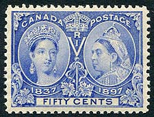 Canada #60. VF mint Never Hinged example of the 50c ultramarine Queen Victoria 1897 Jubilee issue. A tough stamp to find in Never Hinged condition, with some minor gum bends, noted strictly "for the record". A lovely stamp. 2026 Scott US$775.00 =