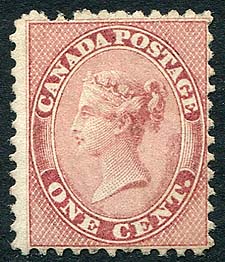Canada #14. Sound and VG/Fine mint (likely regummed) Hinged example of the 1859 issue 1c rose Victoria. A good start to a mint "First Cents" set. 2026 Scott US$750.00 =