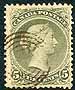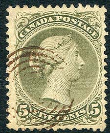 Canada #26a. F/VF used example of the 1875 issue 5c olive green Large Queen exceedingly rare perf 12 x 12. Considered by many to be the key Large Queen value. Missing from most collections. 2026 Scott US$1,000.00 =