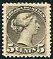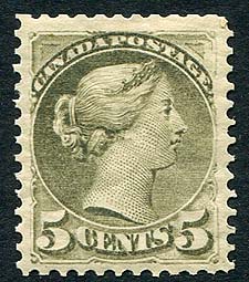 Canada #38a. F/VF centered mint original gum, lightly hinged 5c slate green Small Queen, perforated 11 1/2 x 12. Well centered within balanced tight margins, but with some slightly shorter perfs UR corner. The original owner noted that this has a Greene Certificate, but we did not find it when sorting the estate. A scarce mint single, conservatively valued as fine (VF is $1500.00 catalogue). 2026 Scott Classic US$1,250.00 =